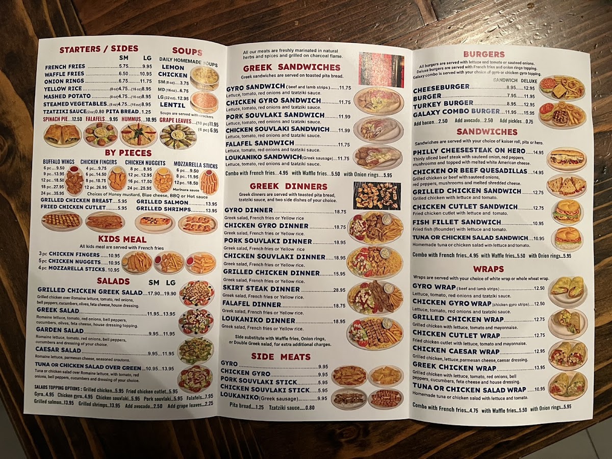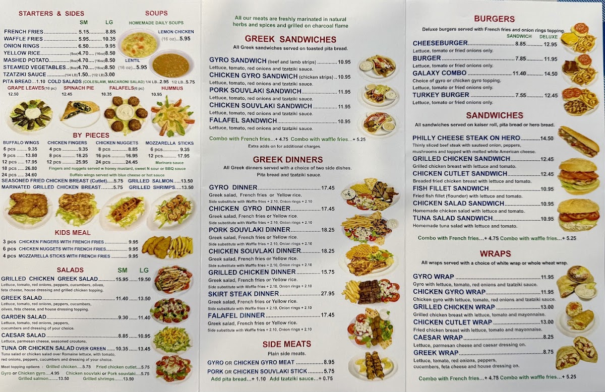 For those looking for a hearty meal, the Greek Dinners are a must-try, with choices like Gyro Dinner, Chicken Gyro Dinner, and Pork Souvlaki Dinner. Each dinner is served with two side dishes of your choice, making for a well-rounded and fulfilling meal. If you're in the mood for something more casual, the Burgers and Sandwiches section offers options like the classic Cheeseburger, the Galaxy Combo with a choice of gyro or chicken gyro topping, and the flavorful Philly Cheesesteak on Hero.